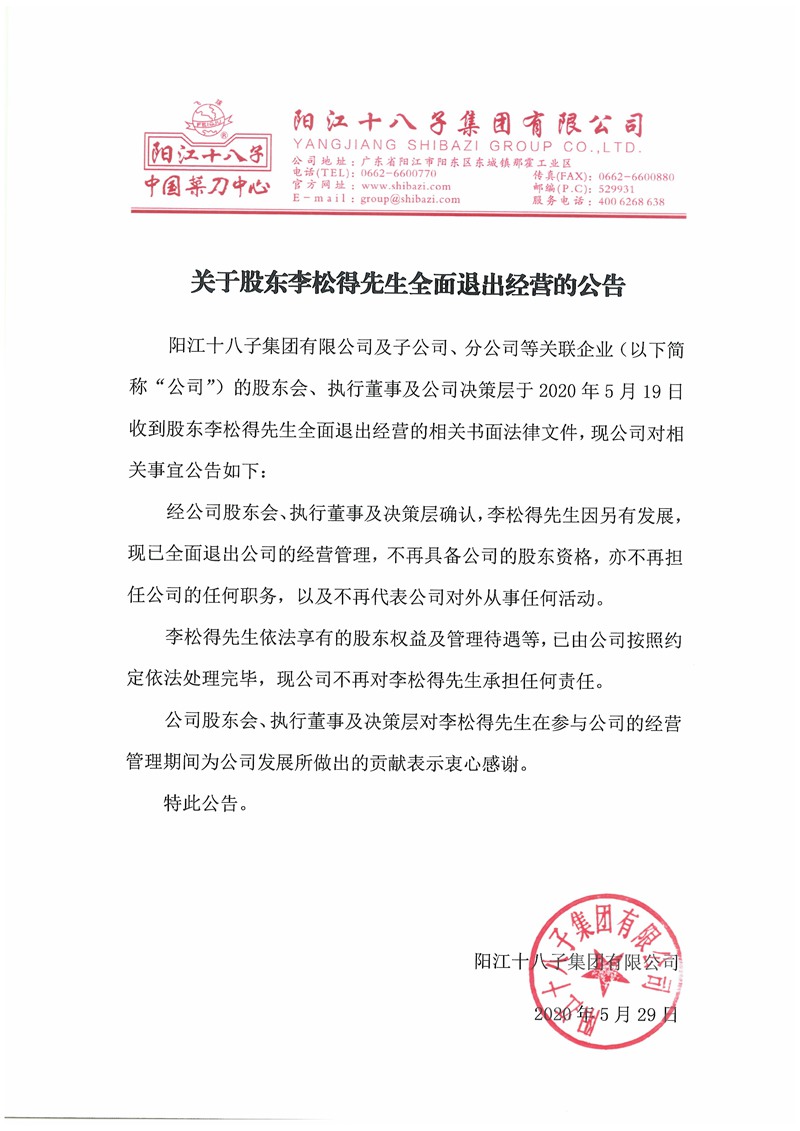 關于股東李松得先生全面退出經營的公告